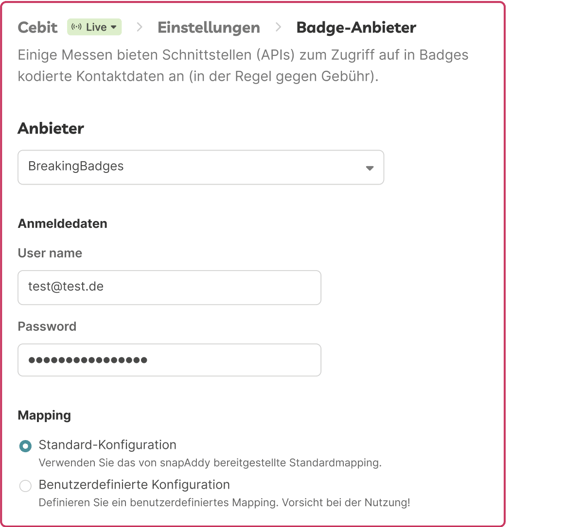 Falls Sie Probleme bei der Anbindung haben oder der snapAddy Support Ihren Anbieter verbinden soll, dauert die Implementierung für bekannte Badge-Anbieter i.d.R. einen Werktag. Wenn der Anbieter in der Liste der Anbieter nicht vorhanden ist, melden Sie sich bitte spätestens 6 Wochen vor Beginn der jeweiligen Messe bei Ihrem Customer Success Manager oder nutzen Sie unser Bestellformular für den Badge-Scan, um die Verbindung zu snapAddy VisitReport einzurichten. Dazu ist eine API-Dokumentation Ihres Messeanbieters zwingend erforderlich.