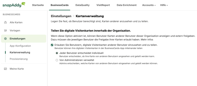 Aktivieren Sie die Kartenfreigabe. Sobald diese aktiviert ist, können Benutzer in der BusinessCards-App die digitalen Visitenkarten ihrer Kollegen aufrufen und teilen. Admins und Manager können die Freigabe von Visitenkarten in der Kartenverwaltung einrichten.
