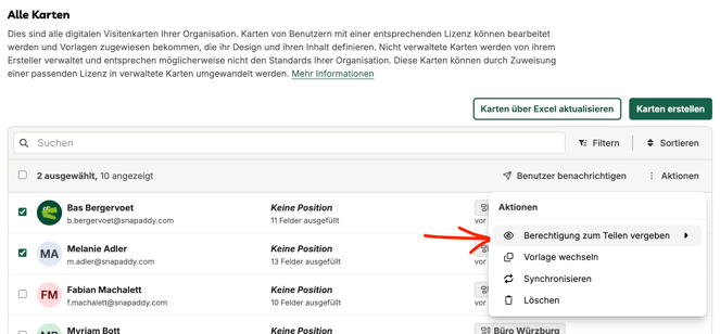 Admins und BusinessCard Manager können die Berechtigung zum Teilen für Karten von Benutzer direkt in der Tabelle „Alle Karten" festlegen.