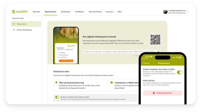 Benutzer Ihrer Organisation können im Bereich “Meine Karte” im Dashboard und den Apps individuell entscheiden, ob sie ihre Visitenkarte zum Teilen durch andere freigeben möchten. Falls sich einzelne Benutzer dagegen entscheiden, sind diese weiterhin in der Teamkoordination sichtbar, aber ihre digitale Visitenkarte kann nicht eingesehen oder geteilt werden.