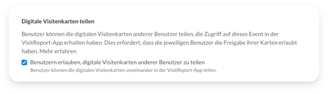 Hinweis: Sobald das Teilen der Visitenkarte in einem Event aktiviert ist, können alle Benutzer mit Zugriff auf das Event die Visitenkarten von allen anderen solchen Benutzern sehen.