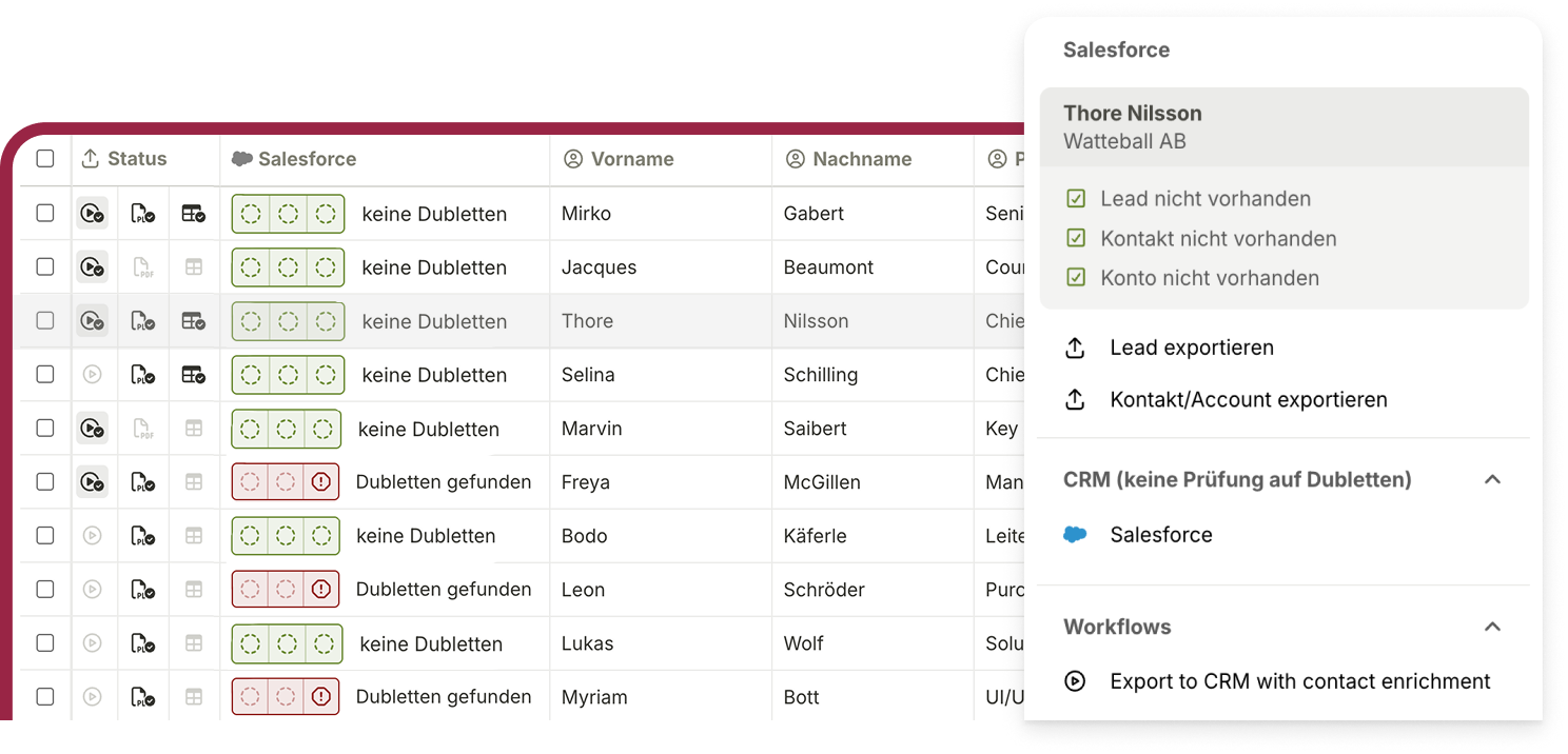 Sie die Ansicht individuell – ganz nach Ihrem Anwen-dungsfall. Intelligente Dublettenerkennung, individuelle Filter und der direkte Export in das CRM-System oder