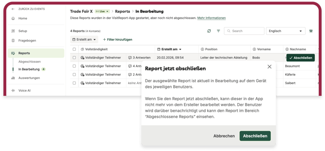 Das VisitReport Dashboard bietet Ihnen zwei separate Ansichten: "Abgeschlossen" für exportierte Reports und "In Bearbeitung" für Reports, die noch auf den Geräten Ihrer Reporter bearbeitet werden. So behalten Sie jederzeit den Überblick über den Status aller Berichte.