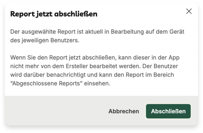 - Sie erhalten nun eine Info, dass der Benutzer den Report nicht mehr bearbeiten kann, sobald sie auf "Abschließen" klicken.