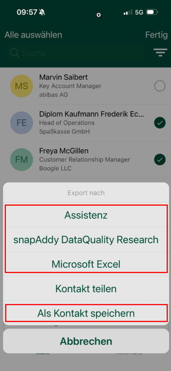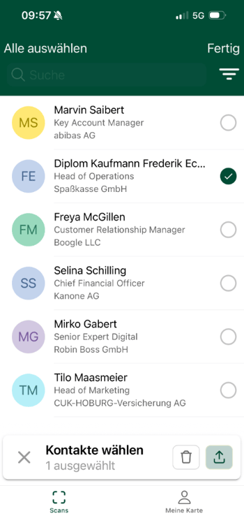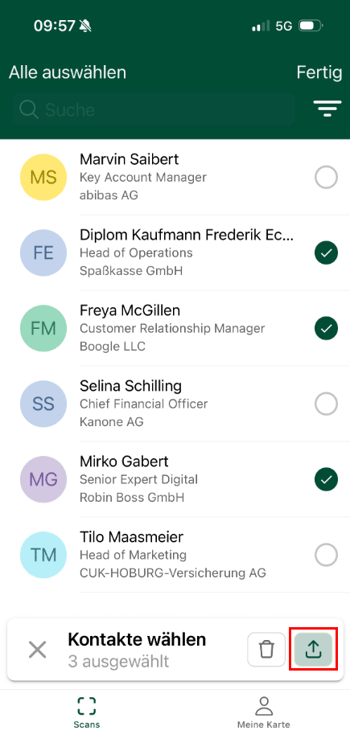 Sie können mehrere Visitenkarten gleichzeitig exportieren. Wählen Sie einfach die gewünschten Kontakte aus und exportieren Sie diese gebündelt an Ihr bevorzugtes Ziel.
