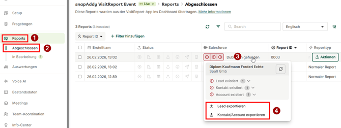 Hinweis: Schlägt der CRM-Export fehl, finden Sie den Report unter „Abgeschlossen" und können den Export dort erneut starten.