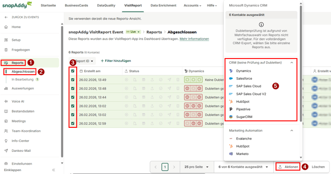 Abgeschlossene Besuchsberichte können von snapAddy VisitReport an das CRM-System exportiert werden. Dafür stehen mehrere Wege zur Verfügung: über das snapAddy Dashboard, die VisitReport App oder via snapAddy DataQuality.