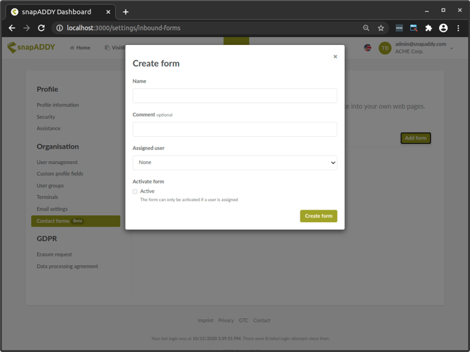 Öffnen Sie, als Administrator im snapAddy Dashboard, zunächst Ihr Profil, und klicken dann unter “Organisation” auf den Menüpunkt “Kontaktformulare”.