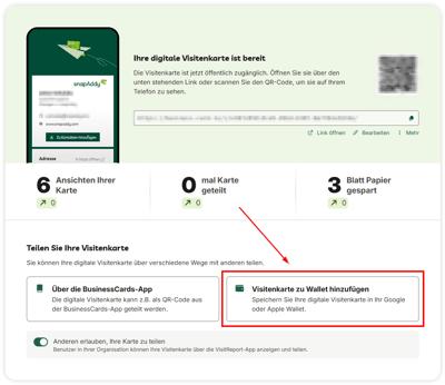 Über das Dashboard die Visitenkarte selbst zum Wallet hinzufügen