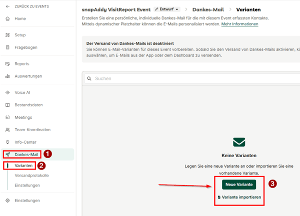 - Navigieren Sie im linken Menü zu Dankes-Mail und wählen Sie dort Varianten aus.