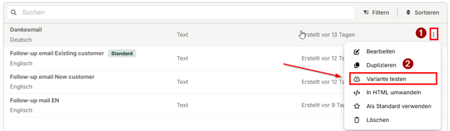- Klicken Sie auf die drei Punkte bei der Dankes-Mail, die Sie testen möchten.