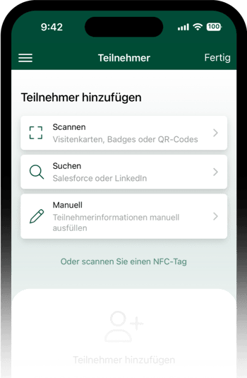 Um einen neuen Besuchsbericht in der App zu starten, bietet snapAddy je nach Konfiguration der Kontaktquellen in den Eventeinstellungen die folgenden Optionen an.