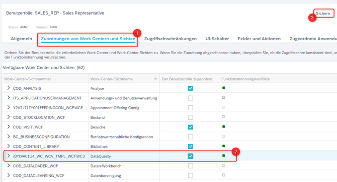 - Ordnen Sie der Benutzerrole den entsprechenden Work Center (+ Sicht) zu.