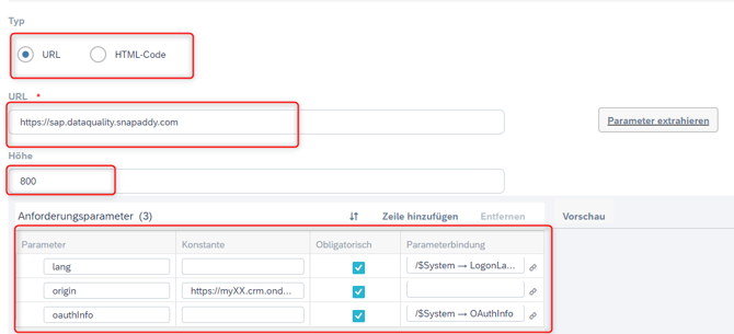 c. Anforderungsparamter: Zeile hinzufügen (optional für snapAddy Auto-Login - bitte lesen Sie unser Tutorial am Ende, wie Sie SAP Auto-Login in snapAddy einrichten)