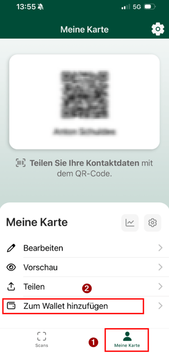 - Tippen Sie auf „Hinzufügen", um die Visitenkarte in Apple Wallet (iOS) oder Google Wallet (Android) zu speichern.