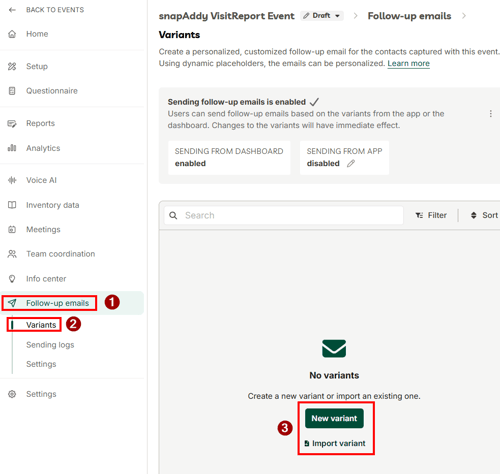 - Navigate to Follow-up emails in the left-hand menu and select Variants.