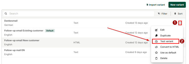 - Test variant: Sends a test email so you can review the result before the actual dispatch.