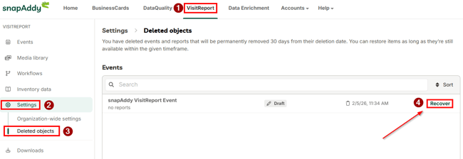 In snapAddy VisitReport, accidentally deleted events or reports can be restored via the "Deleted Objects" section in the VisitReport Dashboard settings. The process is completed in just a few steps.