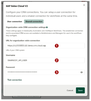 A Shared CRM Connection enables DataQuality Automation and VisitReport Workflows to communicate with SAP Sales Cloud V2 without users needing to connect individually. This article guides you through the required configuration steps.