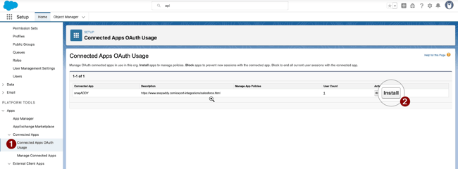The snapAddy Connected App must be installed once by a Salesforce administrator to enable all users in your organization to seamlessly connect snapAddy with Salesforce.