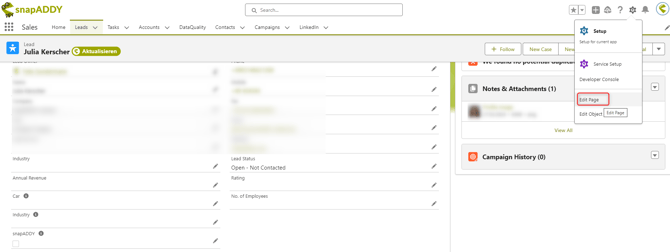 - Open up the detail view of any Lead, Contact or Account and open the "Lightning App Builder" by clicking on "Edit Page" under the settings gear icon in the top right corner.