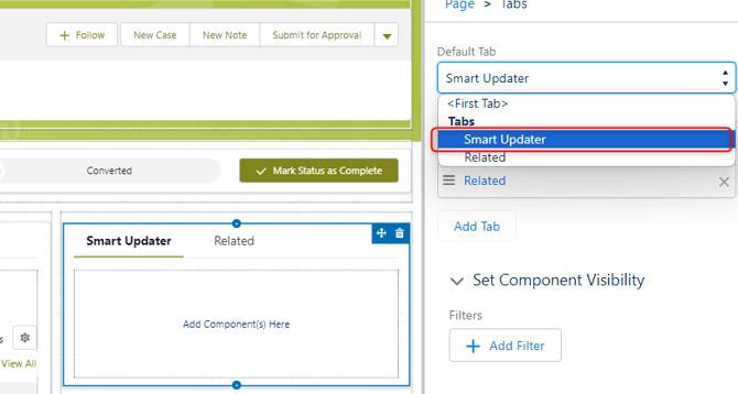 - Move the Smart Updater tab before the first element of the tabs and set the default tab to "Smart Updater". Make sure that this change has been applied correctly. Sometimes it is applied only after the page is saved.