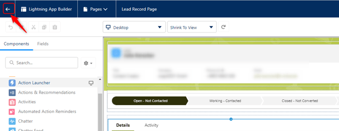 - Leave the "Lightning App Builder" by clicking the arrow in the top left corner.