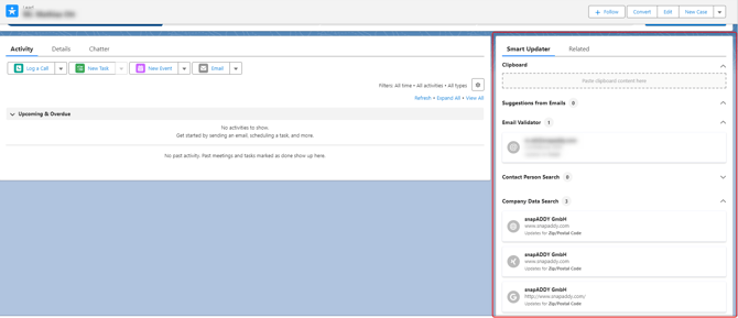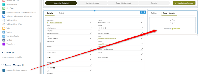 The Smart Updater feature is now successfully integrated into the Lead, Contact or Account detail view.