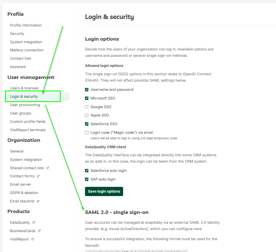 If your organization uses the Security Assertion Markup Language (SAML) standard for login authentication, you can configure snapAddy for login via a supported Single Sign-On (SSO) provider (e.g. Azure AD, G Suite, ADFS, OneLogin, Okta, etc.).