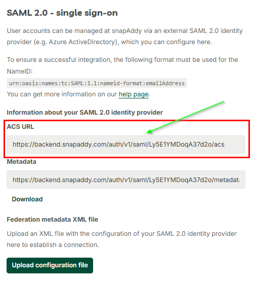 User accounts can be managed at snapAddy via an external SAML 2.0 Identity Provider, which can be configured in the snapAddy Dashboard (app.snapaddy.com). snapAddy uses the email address as a unique identifier for its users. To ensure a successful integration of the SAML 2.0 workflow, the following format must be used for the NameID: